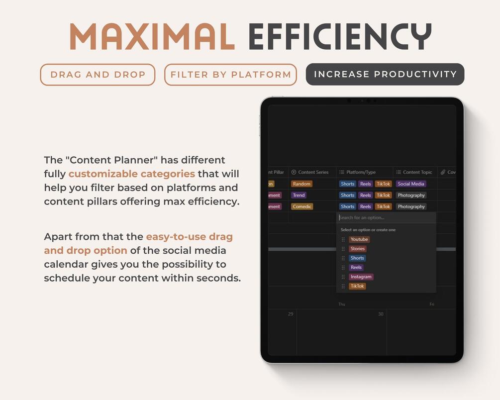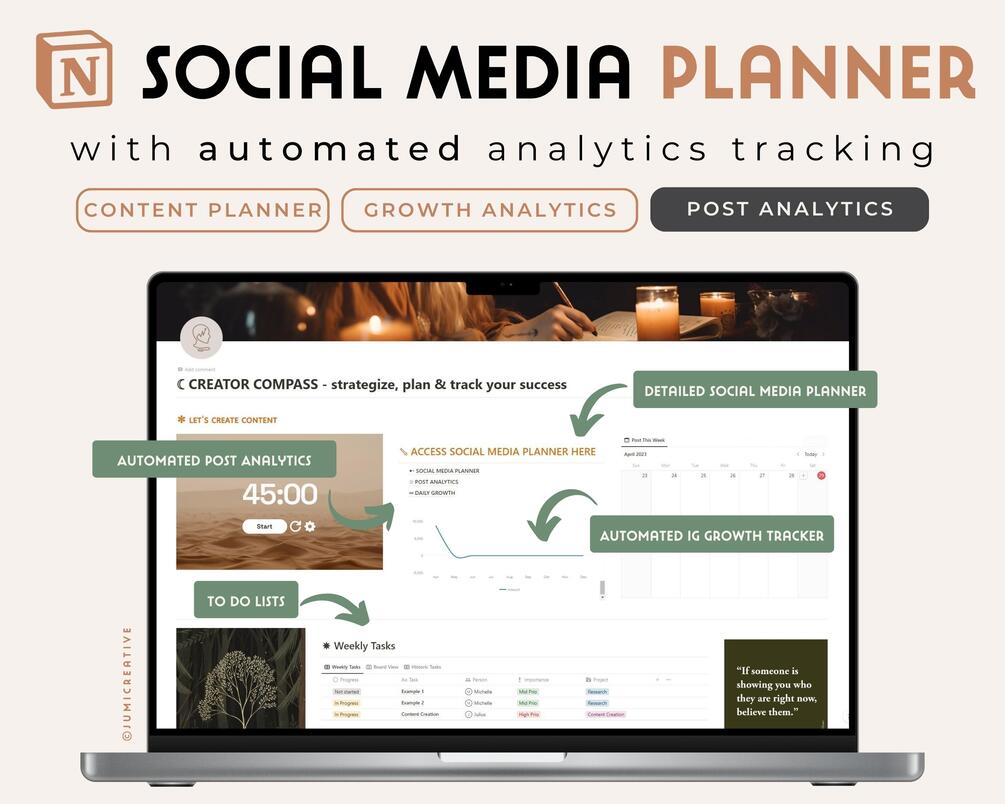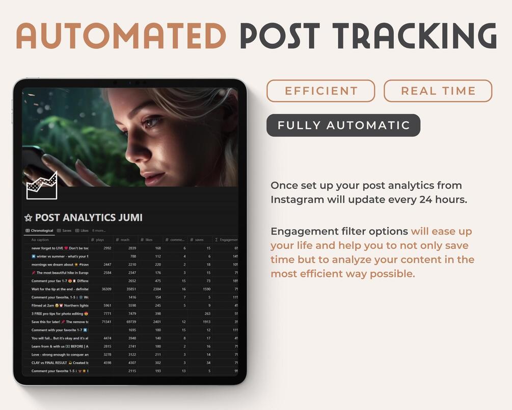 With this unique Notion template you can track your Instagram account post insights and daily growth. You can also plan and schedule your content from scratch including amazing features like automated caption and hashtag creation and content pillars. This is a one of its kind template and we used it to grow a brand new Instagram account from 0 to 13k+ followers in less than 2 months.
